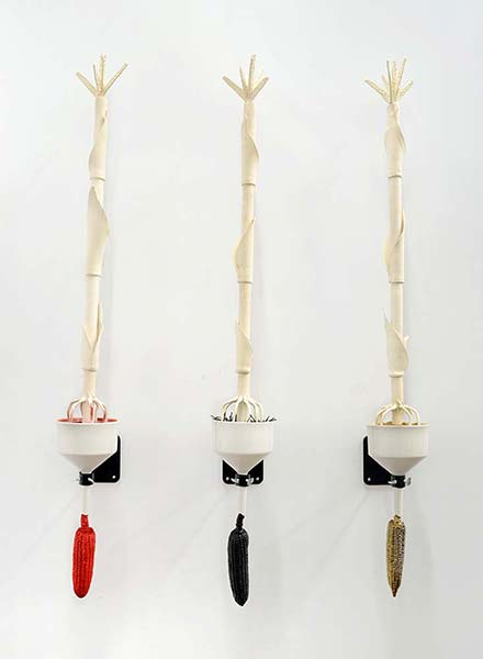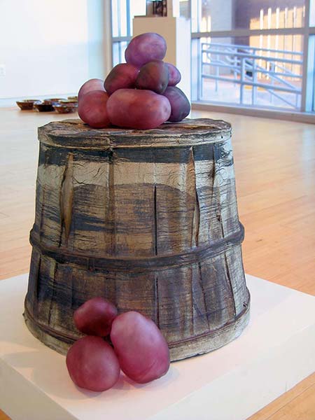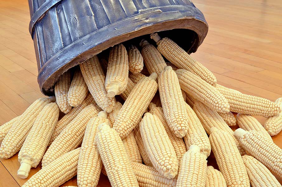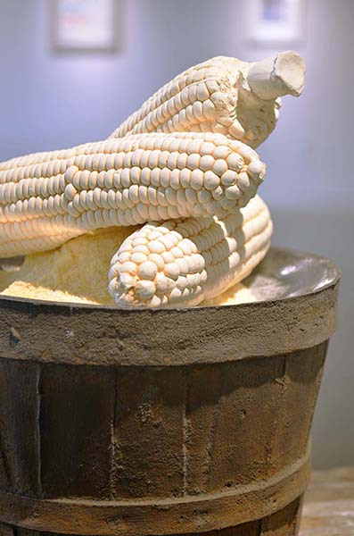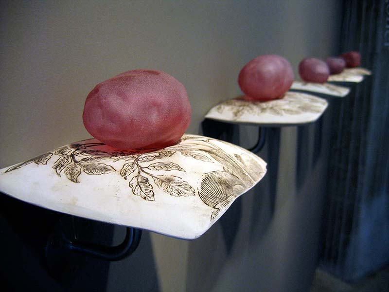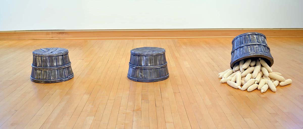 Growing Dilemma considers the changing value placed on agricultural land and it’s products. Through the artifacts of it’s production I am exploring how we value the inputs and outputs of the land. I grew up in Ohio spending my weekends on dairy farms and amongst rolling fields of corn. Watching the landscape change as a response to changes in agricultural practices has made me consider our culture’s expectations for food production and land use. This is reflected in the sculptural objects created in the likeness of known artifacts and those that are artificial.